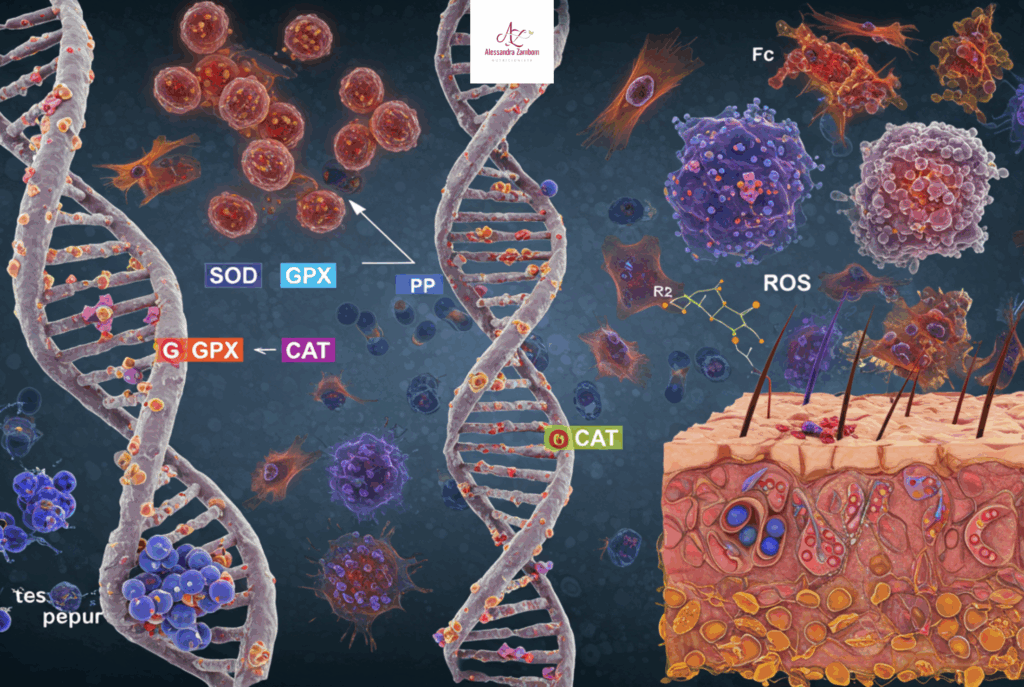 Quero começar esse post fazendo uma pergunta: Você sabe que são os Polimorfismos em genes oxidantes e é seu impacto no envelhecimento precoce? Alguns polimorfismos nos genes que codificam enzimas antioxidantes — como SOD1, GPX1 e CAT — comprometem sua capacidade de neutralizar radicais livres. Isso favorece estresse oxidativo, envelhecimento celular e doenças crônicas. Qual é o impacto no seu corpo?Se você carrega variantes que reduzem a atividade dessas enzimas, pode notar sinais precoces de envelhecimento: pele menos elástica, fadiga, cabelos fracos, maior inflamação e risco de doenças metabólicas. Como intervir nutricionalmente:Alimentos ricos em antioxidantes — como frutas vermelhas, chá verde, cacau puro, cúrcuma e vegetais coloridos — ajudam a ativar vias que compensam déficits genéticos. Além disso, selênio (castanha‑do‑Brasil), vitamina C, E e polifenóis colaboram para restabelecer a defesa celular. Aplicação prática:Inclua vegetais, frutas vermelhas, especiarias como cúrcuma + pimenta preta, chá verde, legumes e oleaginosas diariamente. Adote suplementação sob orientação nutricional se necessário (selênio, vitamina C/E, resveratrol). Conclusão:Compreender os genes antioxidantes e envelhecimento precoce permite moldar sua alimentação para combater radicais livres de forma eficaz. Essa abordagem fortalece sua defesa, aumenta sua vitalidade e previne o envelhecimento celular. Se você tem problemas com envelhecimento precoce, você precisa entender mais sobre seus genes oxidantes em especial os polimorfismos e eu posso te ajudar com isso, clique no banner abaixo ou scaneie o qr-code pra gente conversar! ❤️